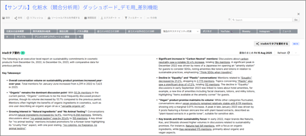 - Iris タブ要約(ダッシュボード・タブ単位):ワークスペース全体の戦略アナリストとして機能します。ダッシュボードのタブ内の全コンポーネントを統合し、チャート、感情トレンド、数値の変化を解釈して、自然言語によるまとまりのあるエグゼクティブ・サマリーを生成します。