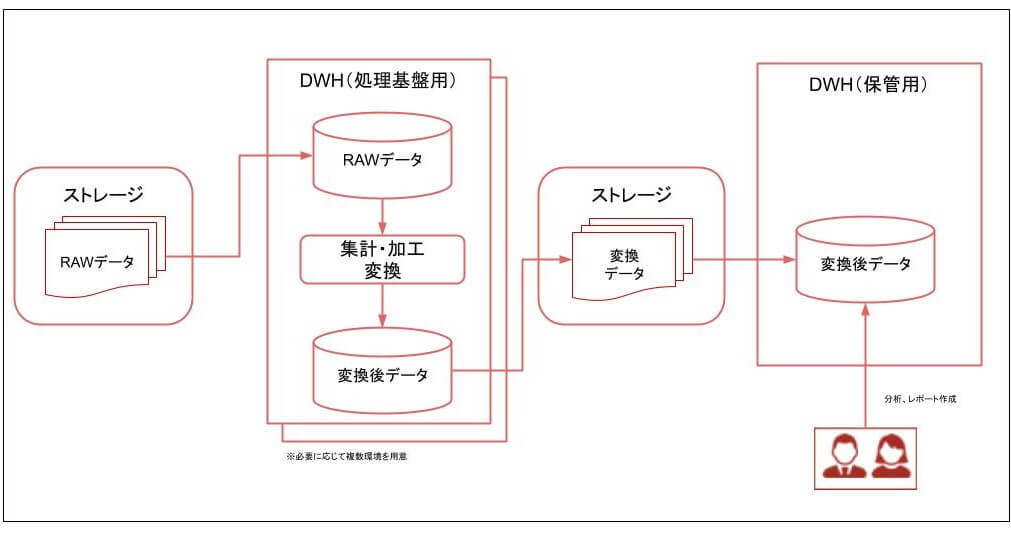 前提として、処理中にDWHからレポートの閲覧が遅くなったという事態に陥らないように、データを保存する目的のDWHとは別に、分散処理基盤専用のDWH環境を構築しておくことをお勧めします。