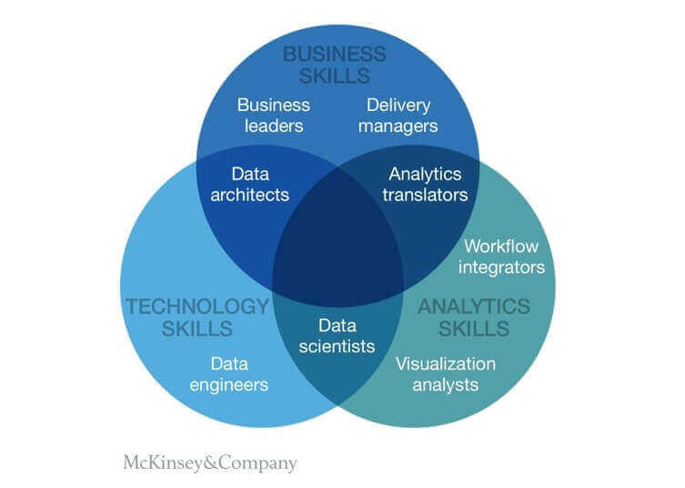 このように、「何を成し遂げたいのか」によってデータ分析の方向性や必要人材が異なってくるので、データ分析に携わる人材がデータサイエンティストだけに限定されないのである。 最近ではさらに役割分担が細分化されており、ビジネスとデータ分析をブリッジする「アナリティクストランスレーター」や、エンジニアリングとビジネスをブリッジする「データアーキテクチャー」といわれるような役割が一般化されてきている。