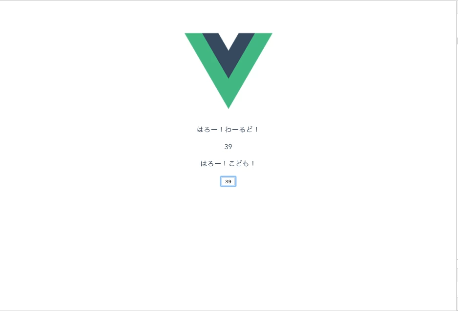「はろー!こども!」下部(子コンポーネント)に数値ボタンを押すとカウントアップし、同時に「はろー!わーるど!」下部(親コンポーネント)のカウントがアップする