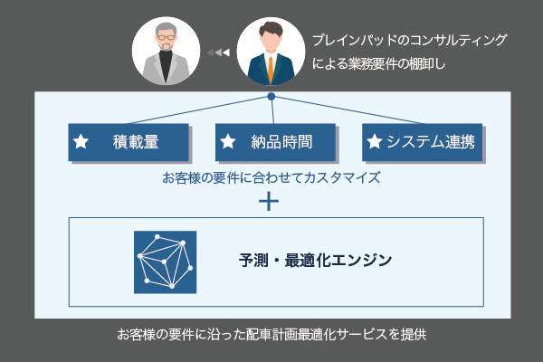 現場担当者へのヒアリングから業務プロセスの棚卸しを行い、優先順位をつけて改善効果の高い要件を洗い出しました。さらに、すぐに着手可能なタスクを見積り、クイックに課題にアプローチ。そして、最適な配車シフトを算出する機能を持つ当社エンジンをベースに、顧客が所有する業務データと制約条件をもとにしたカスタマイズを適用しました。要件に合わせた最適化計算を行うモデルを設計・構築することにより、これまで人手で行っていた日毎の配車計画、車両台数やルートを自動で算出できるようになりました。