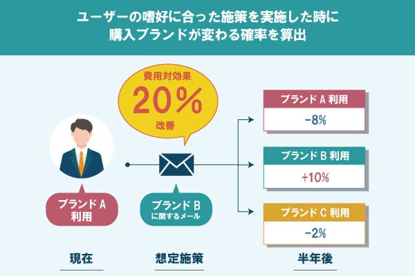 オウンドメディアの会員データやWebサイトの閲覧履歴などの行動データ、マーケティングキャンペーンによる会員との接触履歴データなどをもとに会員の嗜好性、つまりどの銘柄が選ばれやすいかを予測する機械学習モデルを構築し、各銘柄の選択確率として数値で表しました。
