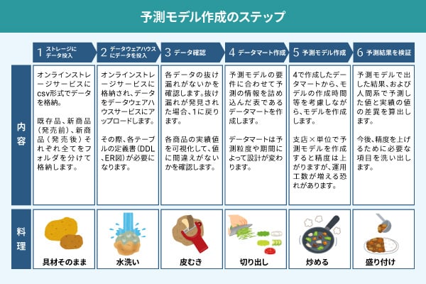 予測モデルの作成や在庫削減効果の試算にあたり、分析環境(AWS環境)を構築。分析環境へのデータ投入から、データの確認、データマート作成、予測モデルの作成、予測結果検証といった一連のプロセスを調理に例えてご説明するなどして、分析の手順や分析プロジェクトの進め方について理解をより深めていただくことができました。