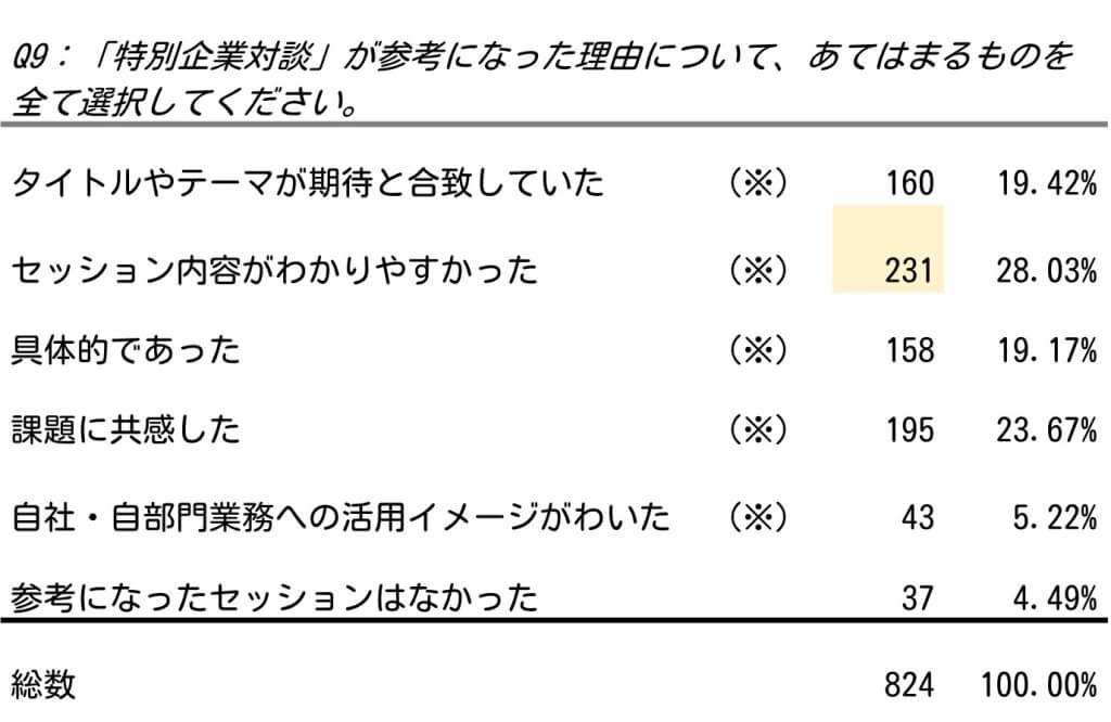 評価のポイントは「セッション内容が分かりやすかった」が最も多く28.03%。「参考にならなかった」割合は4.49%でした。96%は、セッション内容自体と期待値のギャップが許容範囲内であったことがうかがえます。