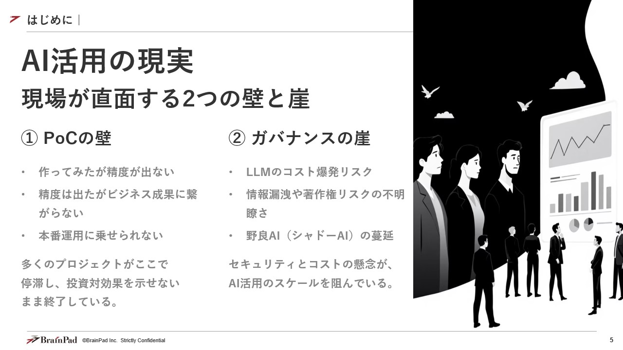 ブレインパッドがデータ分析の専門家として、多くの企業のAIプロジェクトをご支援する中で目にしてきたのは、AI活用を本格化させようとする企業が必ず直面する、「2つの壁」の存在でした。