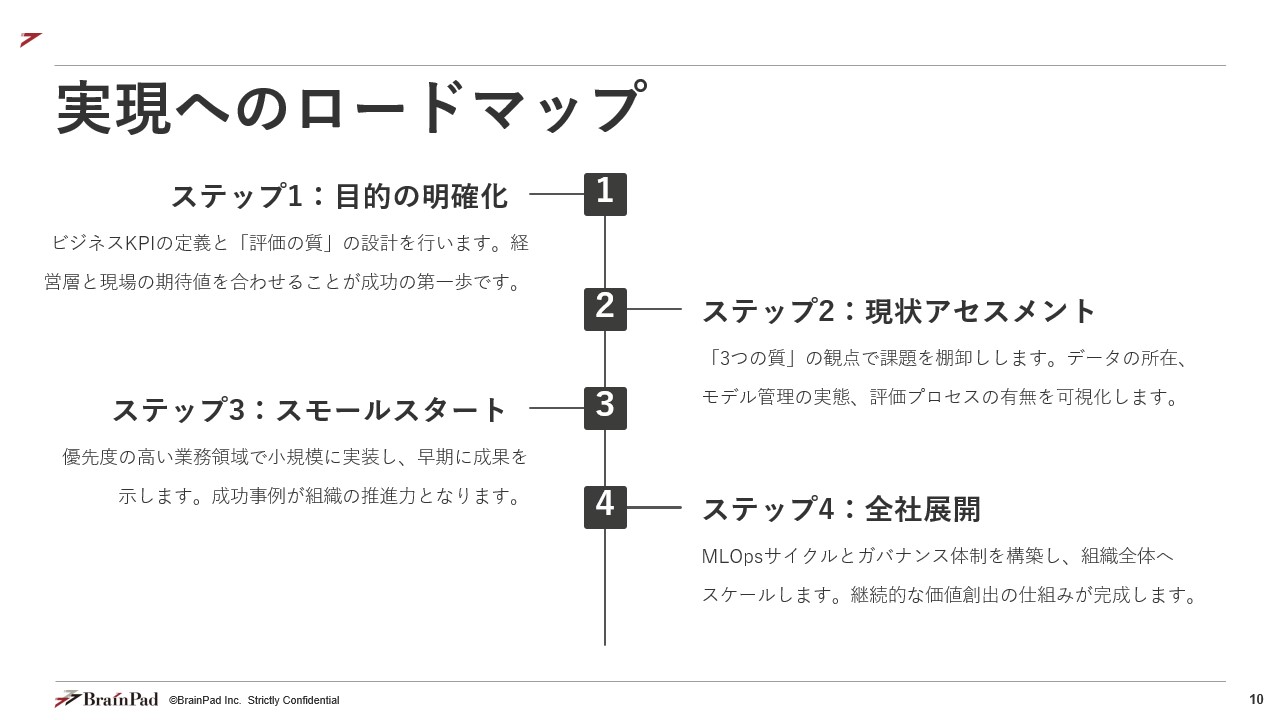 ステップ3で「AIの燃料供給(データの質)」が安定化した上で、初めて「AIモデルの運用(AIの質)」と「ガバナンス(守り)」の仕組みを構築し、スケール(全社展開)させていきます。