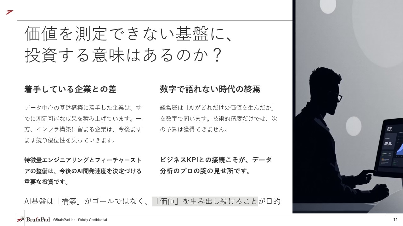 我々データ分析のプロフェッショナルは、AIの「入口(データ)」から「出口(ビジネス価値の測定)」までを深く理解しているからこそ、お客様のAI投資が「コスト」で終わるのではなく、「測定可能な価値」を生み出し続けるための、最も現実的なパートナーになれると確信しています。