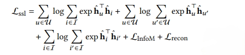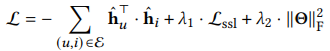 上記の自己教師あり学習の損失関数と、レコメンデーションの損失関数を連結させて、AutoCFモデルの損失関数とします。3項目は正則化項です。