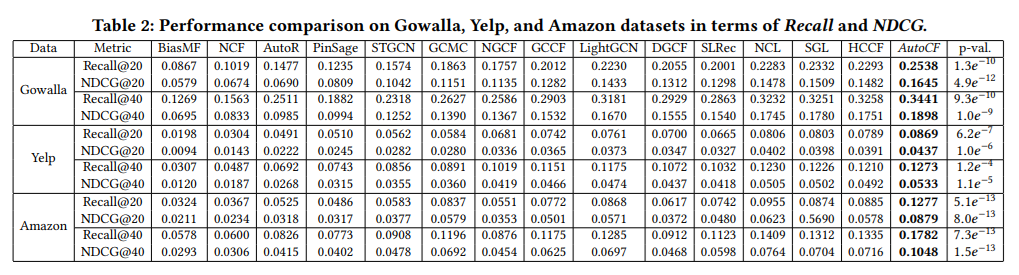 このようなモデル構造により、AutoCFは2023年時点では最高レベルの精度を達成しました。下の表5が代表的なモデル間での精度比較です。右側5列が自己教師あり学習ベースのモデルとなっています。