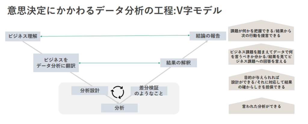 データ分析関連の書籍などで多いのは、どちらかといえば狭義の分析のノウハウを扱った内容だという印象を持っています。テキストなどで独学をしていくと、分析のノウハウを得ることはできるけれど、なかなか成果に繋がらないように感じます。
