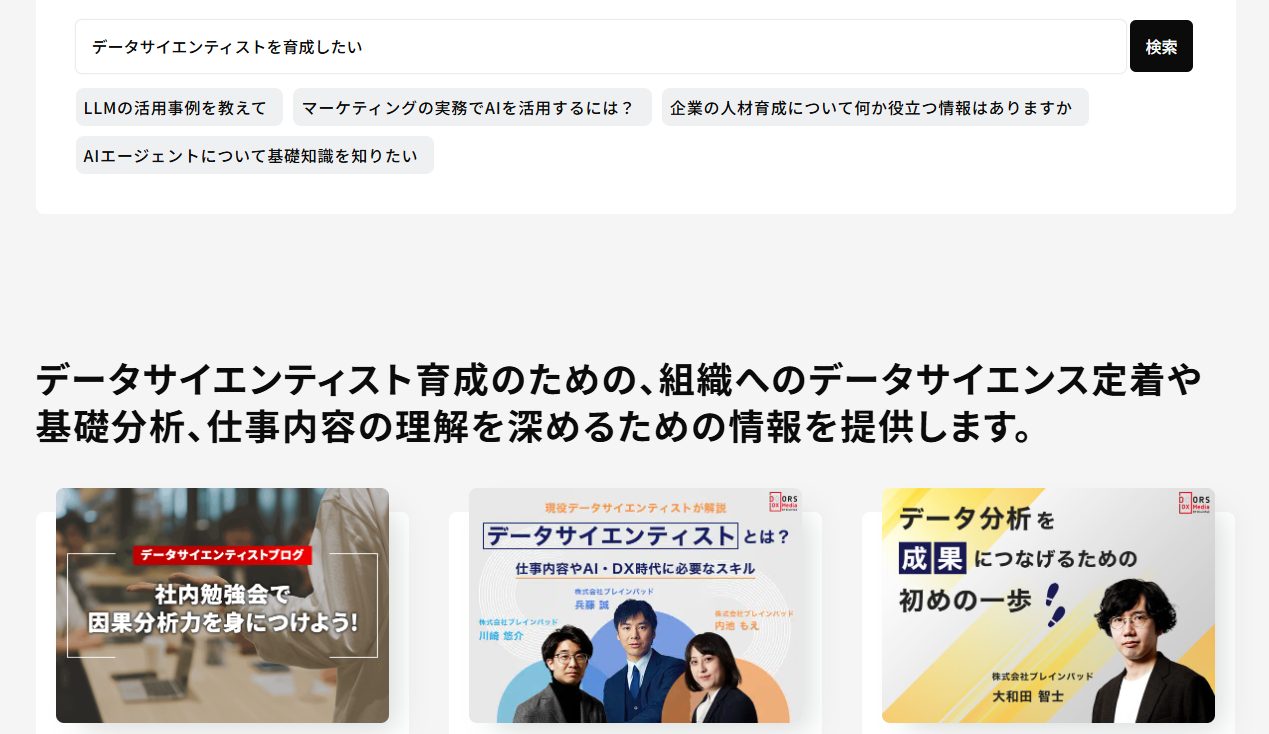 例えば、DOORSメディアで「データサイエンティストを育成したい」と検索すると、下の画像のように「データサイエンティスト育成のための、組織へのデータサイエンス定着や基礎分析、仕事内容の理解を深めるための情報を提供します」といった説明が自動生成されます。