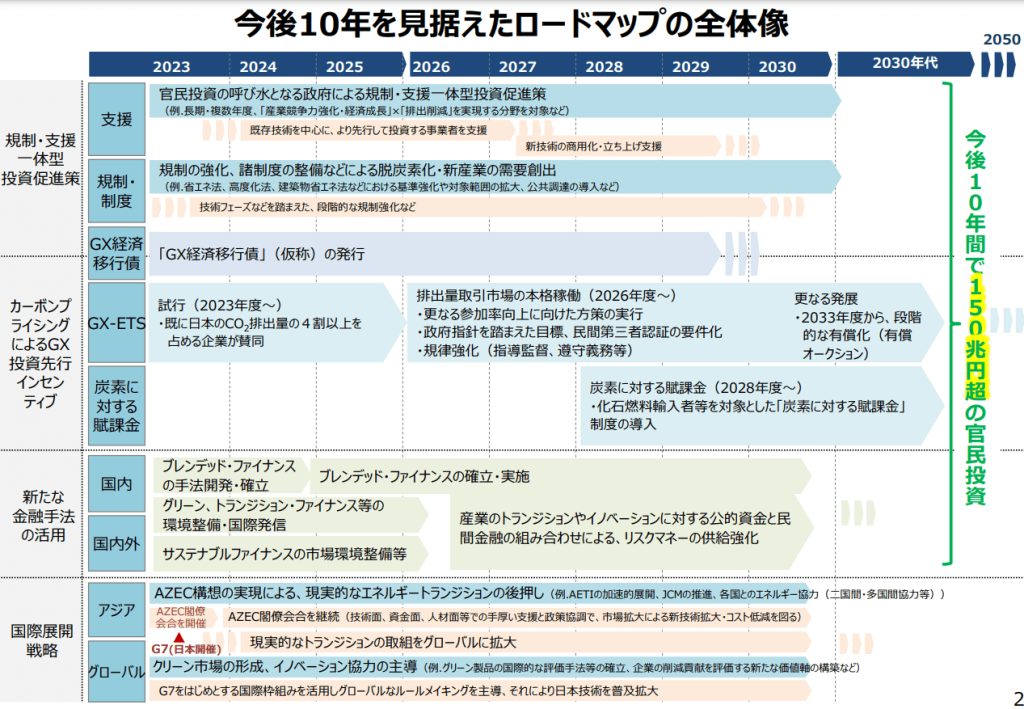 同会議の参考資料には、今後10年を見据えたロードマップの全体像が掲載されており、これからどのようにGXを進めていくのかの道筋が示されています。