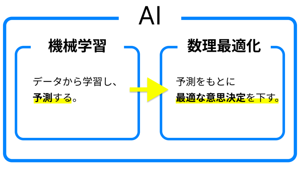 ここでよく混同される「数理最適化」と「AIや機械学習」との違いについて補足しておきます。