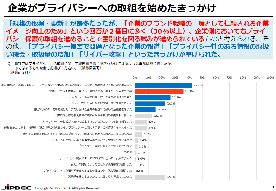 企業がプライバシーへの取り組みを始めたきっかけとして、プライバシーへの取り組みは「企業のブランド戦略の一環として信頼される企業イメージ向上のため」という回答が36.1%ありました。これにより、プライバシーへの取り組みが他社との差別化につながると考えている企業が多いことが分かります。