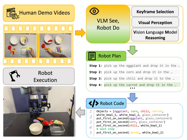「SeeDo」は、人間が作業している様子を撮影した動画から学び、作業内容をロボットが実行できる形に変換する画期的なAIシステムです。これまでのAI研究では、主にテキストや静止画像からの学習が一般的でしたが、「SeeDo」は動画を直接入力として扱う新しいアプローチを採用しました。ご紹介する方法は、人間が実際に目で見て学ぶのと同じように、より自然な形で作業を理解できる利点があります。すなわち、まるで指導者が直接ロボットに作業を教えているかのような機能と言えるでしょう。