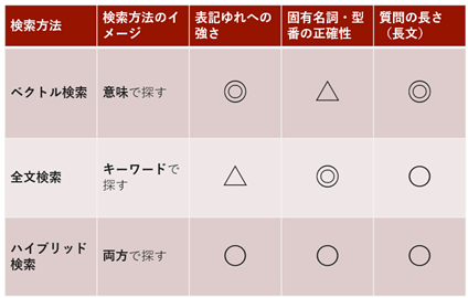 多くのツールでは「ベクトル検索」「全文検索」の2つの検索ロジックに加え、ベクトル検索と全文検索の両方を行い、両者のバランスを取った検索結果を出力する「ハイブリッド検索」の3種類から選択することができます。