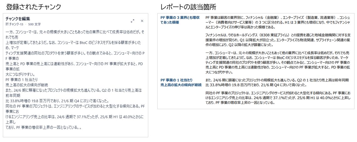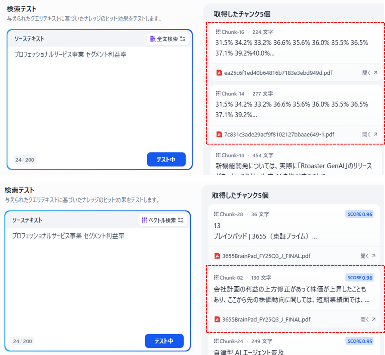 例えば弊社のプロフェッショナルサービス事業のセグメント利益率について質問を行うとします。全文検索では、(データのポイントで記載のとおり、今回はノイズになってしまいますが)セグメント利益率の推移を描いたグラフのチャンクが選ばれてきています。一方ベクトル検索で同様の質問をすると、会社全体の利益に関するチャンクがヒットしていることがわかります。このように異なる対象に対し似通った内容のチャンクがある場合、大まかな意図を捉えるベクトル検索よりもキーワードで狙い撃ちする方が良質な回答が期待できます。