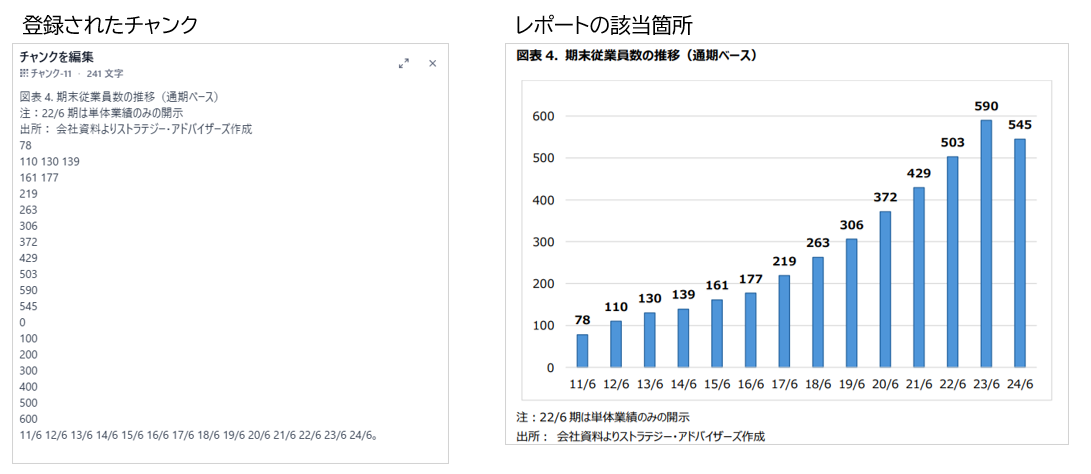 データの前処理は見落としがちな重要ポイントです。特にカスタマイズせずにPDFファイルから抽出された文章にはノイズが入り込むことが多々あり、それが検索に影響を及ぼします。例として、弊社の決算報告に関するリサーチレポートのPDFをDifyのナレッジに登録した結果を見てみましょう。