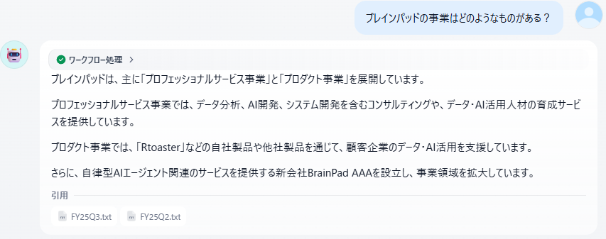 実際にレポートをツールに登録して質問をしてみても、意図通りの回答は得られませんでした(弊社の事業としては「プロダクト事業」と「プロフェッショナルサービス事業」があります)。