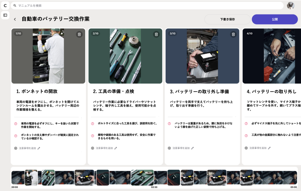 直感的な操作で動画データからマニュアルや報告書が作成されます。