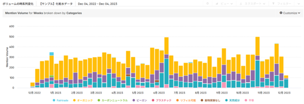 ダッシュボード:化粧品のSDGsとサステナビリティに対する投稿量および傾向の一覧