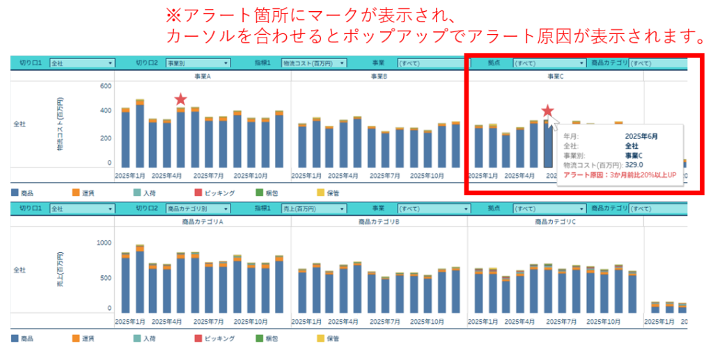 | ② 問題範囲の絞り込み | 売上・コスト比較画面でアラートを確認し、特定の拠点・事業の輸配送コストに問題箇所を絞り込み |