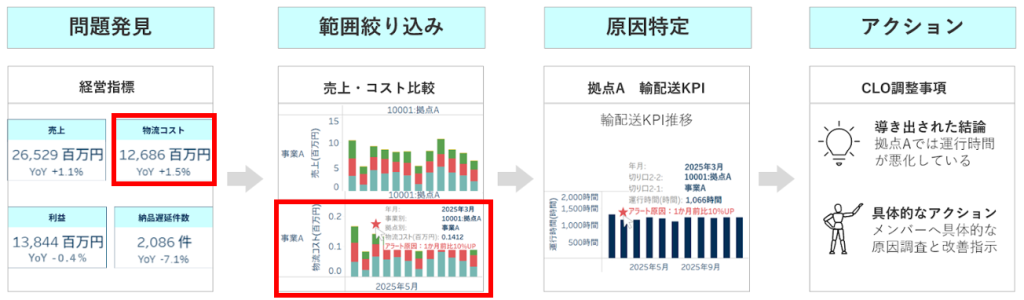 | ① 問題発見 | 経営指標を確認し、物流コストが悪化していることを把握 |