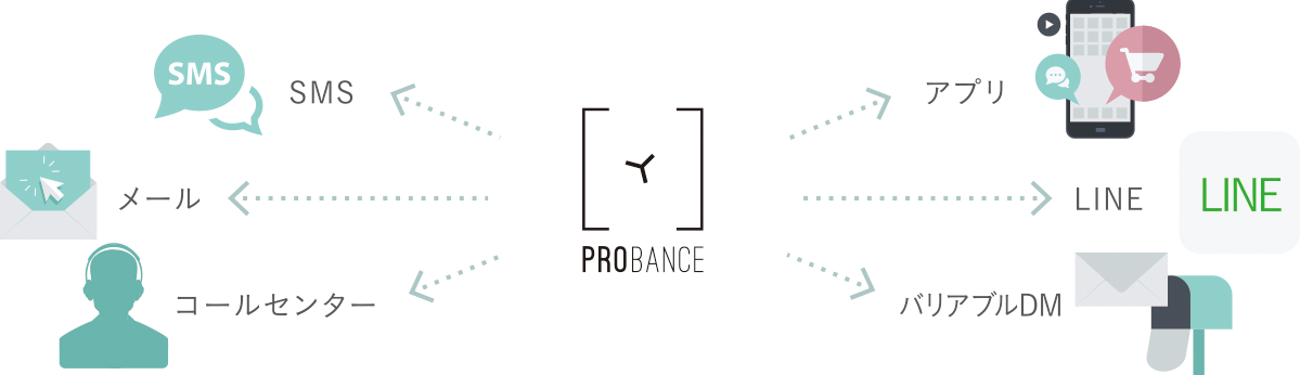 Probanceはメールを中心に、SMS、LINE、アプリプッシュ通知によるメッセージングや、バリアブルDM、コールセンター、外部メール配信ソリューションなど複数のチャネルに連携することが可能です。