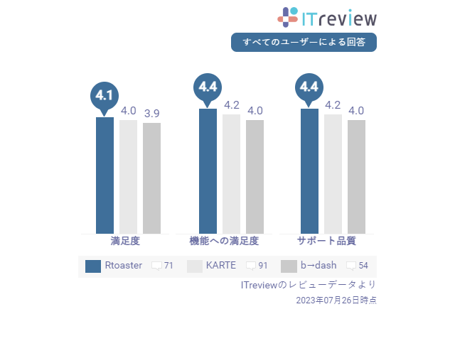 Rtoasterが評価いただいている「機能への満足度」と「サポート品質」については、比較検討されることが多い他社製品と並べても、最も高いというデータでした。