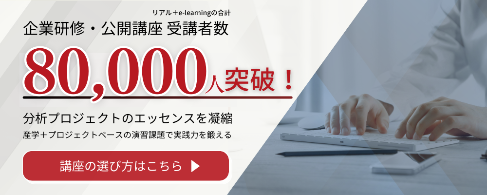 データ活⽤・分析ノウハウを体系化した公開講座のパッケージをベースに、貴社ビジネス課題やスキルレベルに適した研修を提供します。