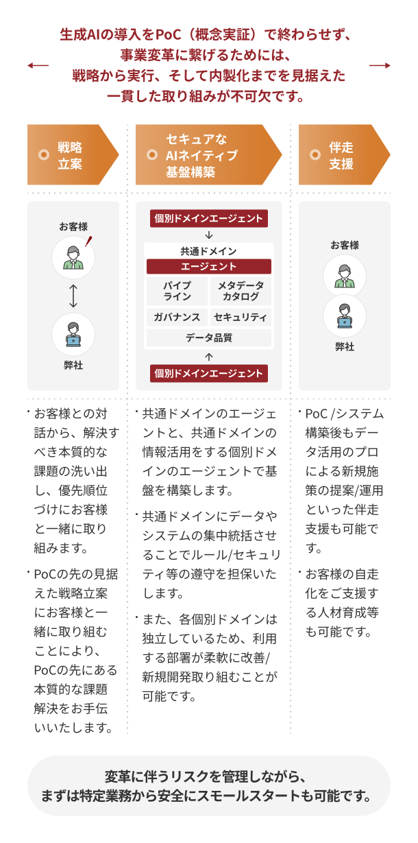 PoCで終わらせない、Vertex AI等の高度な活用を軸とした戦略立案から、セキュアなAIネイティブ基盤の構築、そしてデータ活用のプロによる伴走支援を通じた事業変革までを一気通貫で実現します。ブレインパッドは、VertexAI等の高度な活用戦略の策定から、全社統制とセキュリティを両立する「AIネイティブ基盤」の構築、さらにはお客様の自走化を支援する人材育成までを“一丸”となって支援します。
