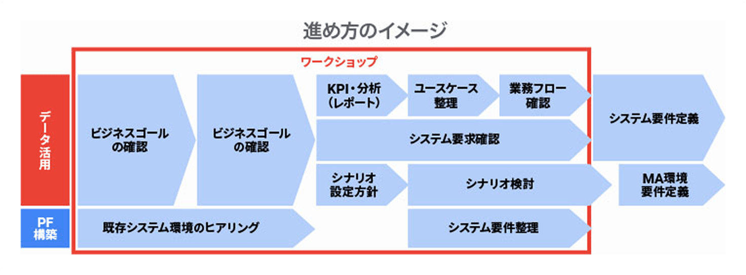ワークショップを通じて、現状の業務やデータだけでなく、将来目指す姿を実現するような構想を共に作り、その実現までをワンストップで支援します。