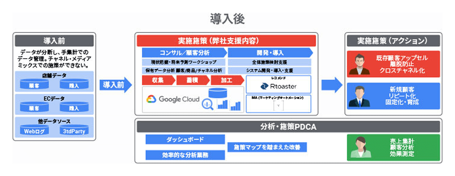 ブランド横断での会員獲得・育成、OMOでの統合した顧客とのコミュニケーション、データドリブンでの施策の実現など、データ活用により解決できるマーケティング課題を解決するためのエンジンとなるプラットフォームを構築します。