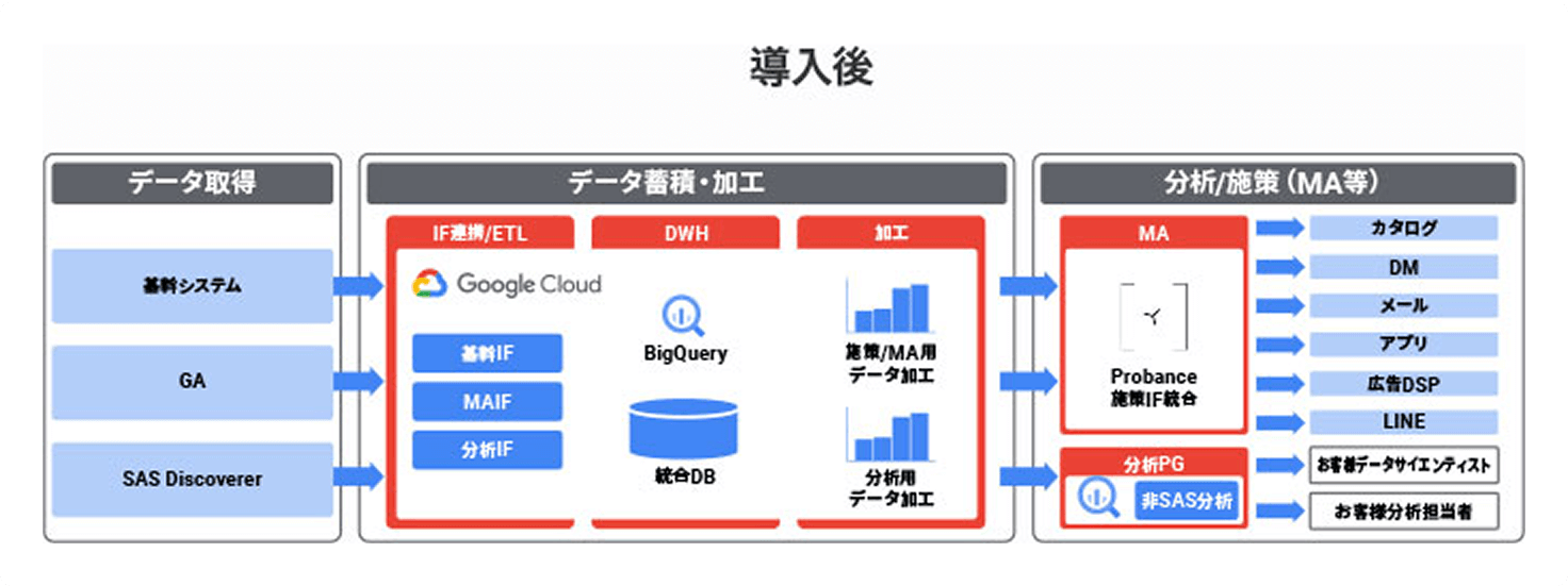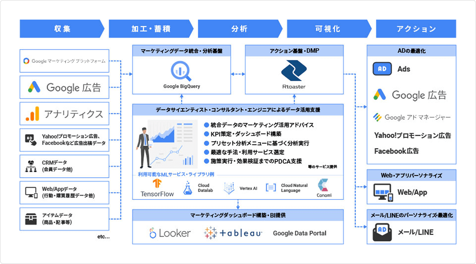 - 三菱地所リアルエステートサービス株式会社様に対して、各種データ収集・統合した分析基盤をGoogle Cloud上に構築しました。散財していたデータを一元管理することで、マーケティングや顧客などの分析をシームレスに実施できるようになりました。また、分析した結果をダッシュボードで可視化することで、施策実行から効果検証のPDCAを回す事が容易になりました。