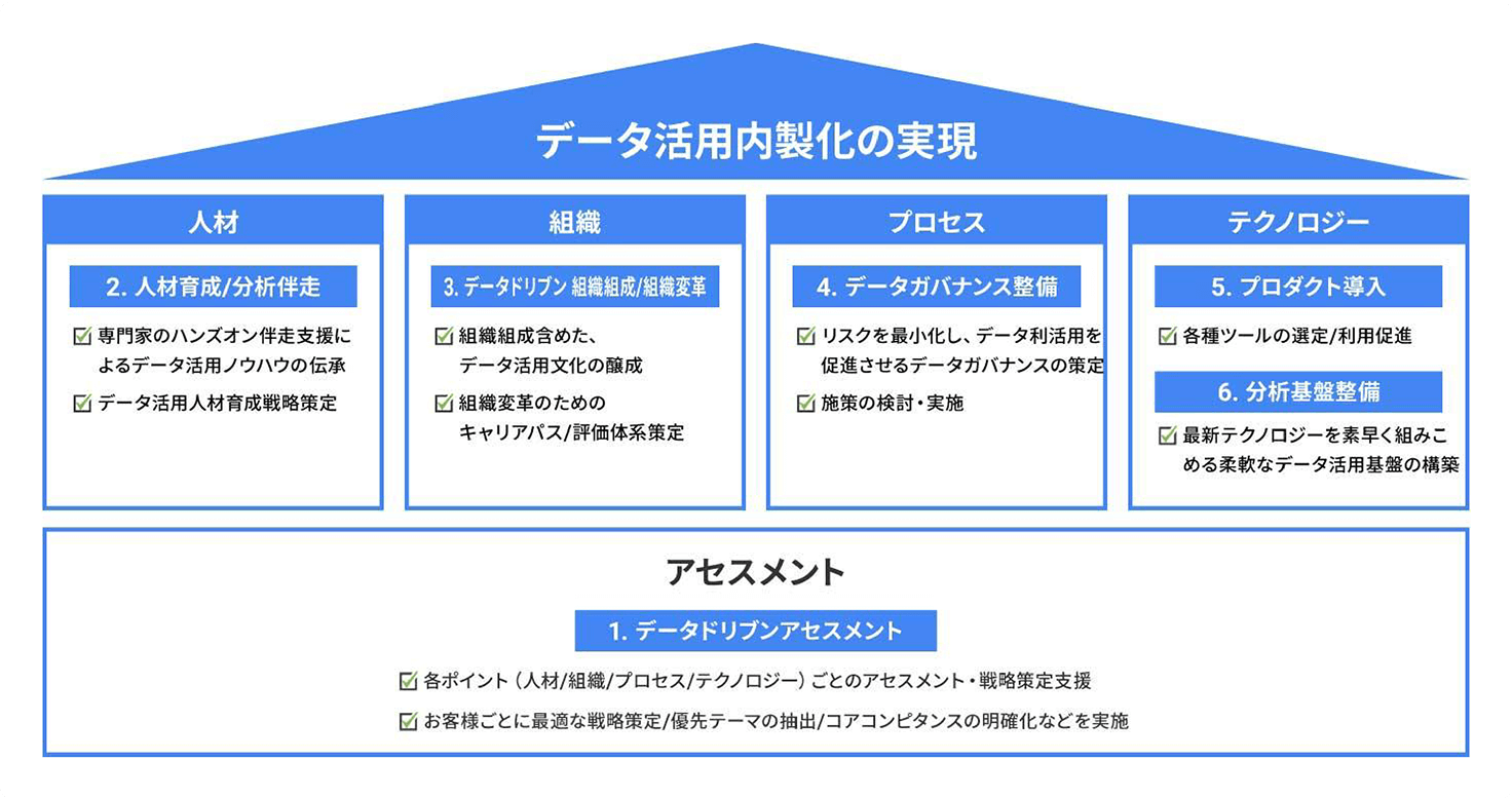 企業におけるデータ利活用促進に向けて、各種取り組みを自走できる状態までデータ活用のバリューチェーン全体を支援いたします。