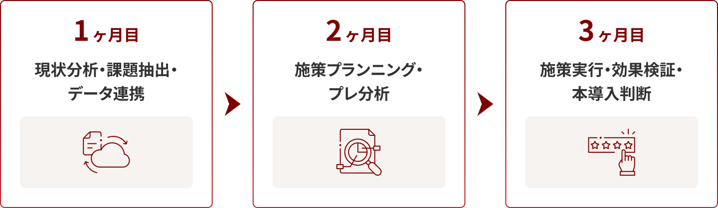 「お試し3ヶ月PoC」(有償)データをお預かりし、分析〜施策実行〜効果検証までを3ヶ月で実施。